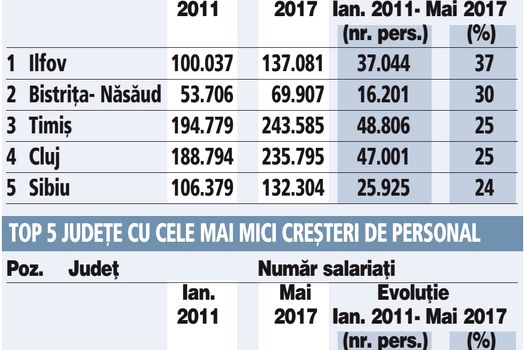 De partea cealaltă, cu creşteri doar de 4- 6%, de trei ori mai mici decât media naţională, sunt judeţele Gorj, Brăila, Caraş-Severin, Constanţa şi Vâlcea. Dintre acestea, Gorj, Brăila sau Caraş-Severin oricum erau în topul cu cei mai puţini angajaţi din economie raportat la populaţia totală. În cei şapte ani de revenire după criză, locurile de muncă s-au creat în special tot în zonele care erau deja campioane la numărul de angajări. Aceasta înseamnă o creştere a divergenţei între Transilvania şi restul ţării. „Cluj, Timiş sau Sibiu se află în topul judeţelor care au recuperat joburile pierdute în criză şi au făcut ulterior noi angajări, acestea fiind judeţele în care s-au făcut cele mai multe relocări de personal. Şi noi, şi alte companii din industrie am dus foarte mulţi oameni din alte zone în judeţele din vestul şi din centrul ţării, iar mulţi dintre ei au rămas să lucreze acolo“, a spus Felix Toma, country manager în cadrul firmei de recrutare şi închiriere de forţă de muncă temporară Gi Group România şi Bulgaria. Prezenţa Bistriţiei-Năsăud în clasament se datorează extinderii importante a activităţii producătorului de componente auto Leoni, care a ajuns la 8.200 de angajaţi pe entitatea din Bistriţa în 2016, cu aproape 5.000 de angajaţi mai mulţi faţă de anul 2011.