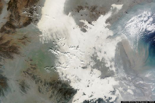 O imagine obţinută cu ajutorul unui satelit arată cum afectează poluarea China, pe o distanţă de 750 de mile, de la Beijing la Shanghai. Norii, la fel ca ceaţa, sunt reprezentaţi cu alb în imagine, în timp ce poluarea este reprezentată cu gri, a explicat NASA.