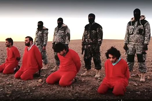 În secvenţa următoare apar cei cinci bărbaţi îmbrăcaţi în combinezoanele portocalii ale ostaticilor SI, în genunchi, în faţa a cinci bărbaţi care au feţele acoperite cu cagule, toţi purtând uniforme militare de camuflaj şi înarmaţi cu pistoale.