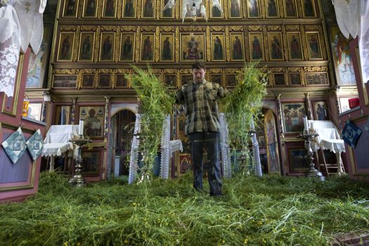 Oamenii pregătesc din timp biserica cea mare, „Sf. Treime”, făcând curat şi aducând iarbă şi ramuri de salcie, ritual mai puţin obişnuit în bisericile ortodoxe. Iarba simbolizează Grădina Raiului, acolo unde a fost înfăptuit păcatul originar, şi unde s-a pogorât Duhul Sfânt pentru prima dată, iar salcia face trimitere la lemnul din care Noe şi-a construit Arca.