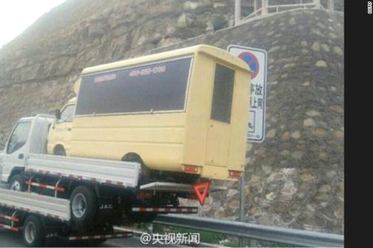 Un şofer chinez a fost amendat după ce a fost suprins conducând pe o autostradă trei camioane încărcate unul peste celălalt, relatează cnn.com.