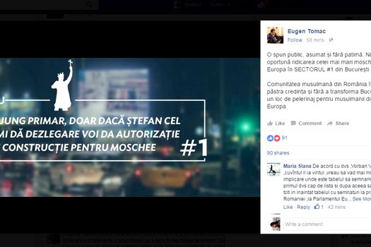 „O spun public, asumat şi fără patimă. Nu consider oportună ridicarea celei mai mari moschei din Europa în Sectorul 1 din Bucureşti”, a declarat candidatul PMP la primăria Sectorului 1, Eugen Tomac, într-o postare pe pagina sa de Facebook.