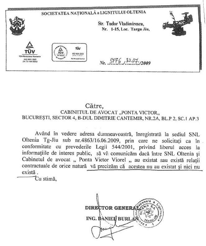 Este prezentată şi o adresă tot din 2009 din partea Baroului Bucureşti, în care se arată că avocatul Ponta nu este şi nu a fost asociat în cadrul societăţii civile de avocaţi Dan Şova.
