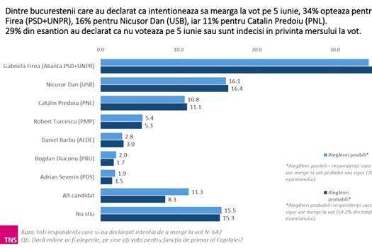 Potrivit rezultatelor pentru alegerea primarului general, dintre cei care au declarat că cel mai probabil se vor prezenta la vot duminică: candidatul PSD Gabriela Firea obţine 34%, Nicuşor Dan 16%, candidatul PNL, Cătălin Predoiu obţine 11% iar Robert Turcescu, 5%.  În sondaj au fost prezentaţi doar şapte candidaţi şi 11% au optat pentru alt candidat, în timp ce 15% sunt nehotărâţi.