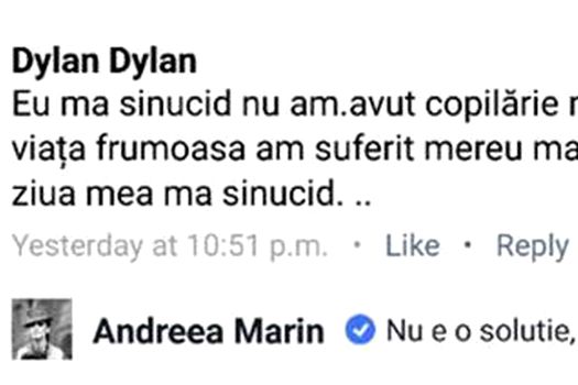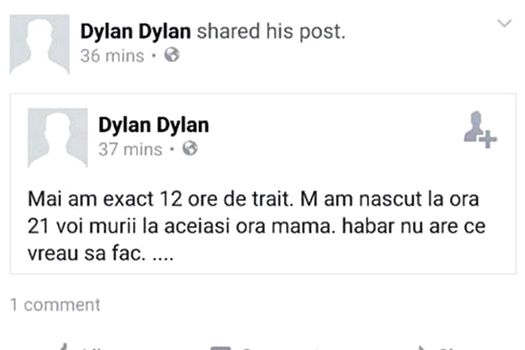 „APEL URGENT!!! Buna dimineata, am primit ieri si am citit in aceasta dimineata mesajul de mai jos scris de detinatorul contului de facebook Dylan Dylan, in care se pare ca un tanar deznadajduit ameninta ca astazi, de ziua sa, se va sinucide.