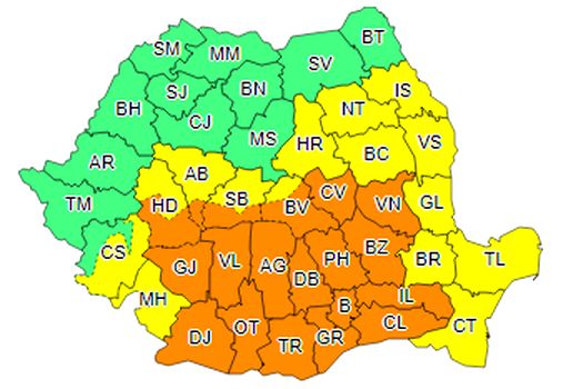 „În intervale scurte de timp sau prin cumulare, în judeţele Gorj, Vâlcea, Dolj, Olt, Argeş, Dâmboviţa, Prahova, Buzău, Covasna, Vrancea, Teleorman, Giurgiu, Ilfov, Ialomiţa şi Călăraşi, în municipiul Bucureşti şi în zona de munte a judeţelor Hunedoara, Alba, Sibiu, Braşov se vor înregistra cantităţi de apă de 50…70 l/mp şi pe arii restrânse peste 80…90 l/mp, îndeosebi în judeţele Teleorman, Giurgiu, Olt, Argeş şi Vâlcea„, anunţă ANM.