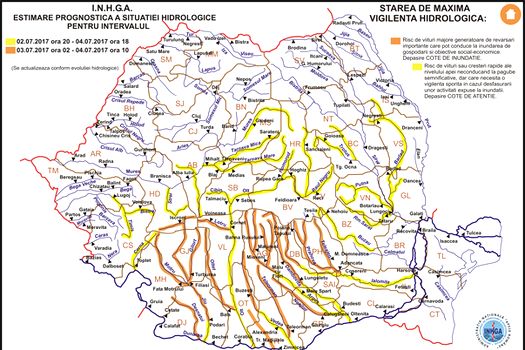 Luni dimineaţa va intra în vigoare un cod portocaliu, valabil până marţi la ora 10.00, „pe râurile din bazinele hidrografice: