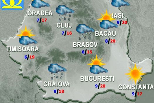 Vremea se va încălzi uşor, astfel încât temperaturile maxime se vor încadra între 17 şi 23 de grade, iar cele minime vor fi cuprinse între 3 şi 12 grade. Ziua, cerul va fi variabil, cu înnorări temporare în zonele montane şi submontane, precum şi în nordul şi sud-vestul extrem al ţării unde, îndeosebi după-amiaza şi seara, vor fi ploi de scurtă durată. Noaptea, cerul se va înnora în majoritatea regiunilor şi va ploua local în Banat şi Oltenia şi cu totul izolat în rest. Vântul va sufla slab şi moderat, cu unele intensificări în sudul Banatului. Dimineaţa, pe litoral vor fi condiţii de ceaţă.
