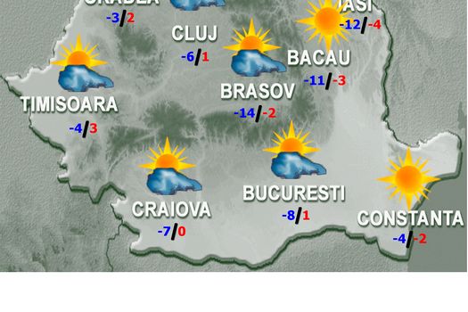Vremea se va încălzi în majoritatea regiunilor, dar dimineaţa şi noaptea, va fi ger, însă pe arii restrânse, mai ales în depresiuni şi în sudul ţării. Temperaturile maxime vor fi cuprinse între -3 şi 9 grade, iar cele minime se vor încadra între -12 şi -2 grade, mai scăzute în estul Transilvaniei, dar şi mai ridicate în Dealurile de Vest. Cerul va fi variabil, iar vântul va sufla slab şi moderat. Local, în zonele joase de relief, îndeosebi în orele dimineţilor, va fi ceaţă.