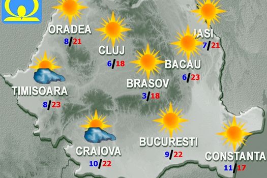 Valorile termice se vor situa în jurul celor normale pentru această dată, exceptând partea de nord şi nord-est a teritoriului, unde vremea va fi răcoroasă. Pe parcursul zilei, înnorările se vor accentua temporar şi va ploua local în Maramureş, Transilvania şi Moldova, dar şi în zona de munte şi cea deluroasă din sud şi pe arii restrânse în rest. Izolat se vor înregistra cantităţi de apă de 15…20 l/mp, cu precădere în zona Carpaţilor Orientali. În cursul nopţii cerul va fi variabil la parţial noros, iar în primele ore izolat va mai ploua slab la munte şi în Moldova. Vântul va sufla slab şi moderat. Temperaturile maxime se vor încadra între 12 şi 21 de grade, iar cele minime între 3 şi 12 grade.