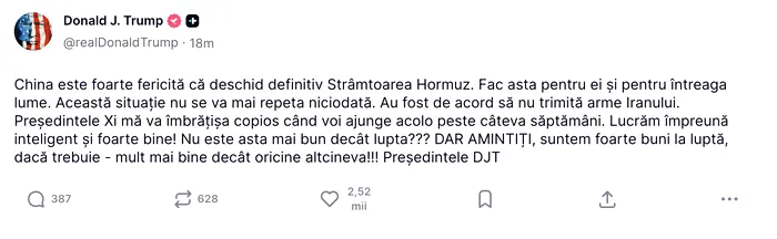 „China este foarte fericită că deschid definitiv Strâmtoarea Ormuz.