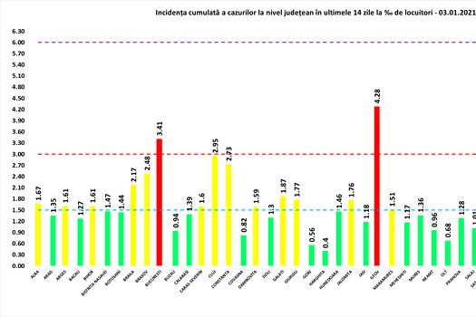 Coeficientul infectărilor cumulate la 14 zile, raportate la 1.000 de locuitori este calculat de către Direcţiile de Sănătate Publică, la nivelul Municipiului Bucureşti şi al judeţelor. Mai jos aveţi graficul realizat în baza raportărilor primite de CNCCI de la Direcţiile de Sănătate Publică: