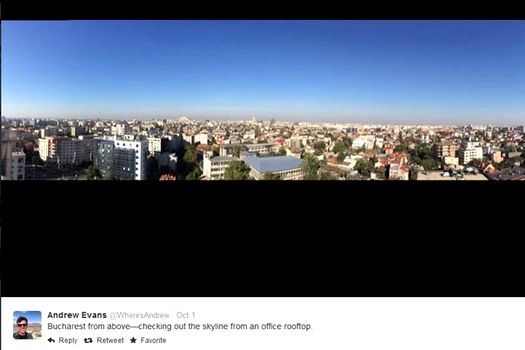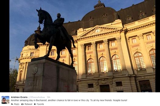 Andrew Evans este editorialist al National Geographic Traveler, pentru care realizează rubrica „Digital Nomad”. El călătoreşte în lumea întreagă şi împărtăşeşte fanilor săi de pe Twitter experienţele pe care le trăieşte în diverse destinaţii de pe Glob, publicând pe această platformă de microblogging numeroase fotografii şi comentarii.