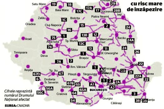 Riscul de înzăpeziri este prezent inclusiv pe cele mai aglomerate drumuri. Spre exemplu, cel mai intens utilizat drum este DN1, şi acesta apare trasat cu roşu (pericol mare de înzăpezire – n.r.) pe aproape toată lungimea lui, excepţie făcând doar partea cu serpentine dintre Predeal şi Braşov. Apoi autostrăzile A1 (Bucureşti-Piteşti) şi A2 (Bucureşti-Constanţa) sunt, de asemenea, semnalate ca înzăpezibile. Şi DN2, care face legătura dintre Bucureşti şi localităţile din Moldova, este în pericol până în zona Râmnicu Sărat, apoi de la Adjud-Bacău până la Roman – Târgu Neamţ. În Dobrogea, aproape toate drumurile prezintă risc de înzăpezire, în timp ce în Banat şi Crişana nu sunt semnalate astfel de pericole.