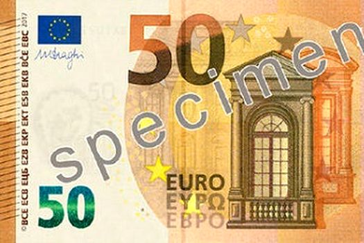 Noua bancnotă europeană conţine un nou portret al zeiţei Europa şi cifra „50” într-o nuanţă de verde-smarald, greu de falsificat. Potrivit unui studiu, banii lichizi rămân metoda preferată de plată la punctele de vânzare.