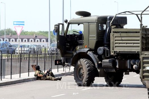 Cu puţin înainte de ora locală 10.00 (10.00, ora României), trei camioane la bordul cărora se aflau persoane înarmate, purtând uniforme militare, iar unele panglica negru-portocalie a Sfântului Gheorghe, au ajuns la aeroport, a constatat un jurnalist AFP aflat la faţa locului.