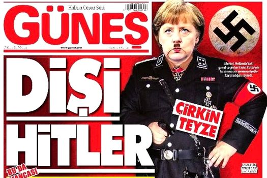 „Hitler la feminin”, scrie alături de imaginea publicată pe prima pagină a cotidianului turc Guneş, unde este de asemenea reprezentată o svastică. Pe pagină mai apar hashtagul #FrauHitler (în limba germană: femeia Hitler) şi menţiunea „mătuşa urâtă”.