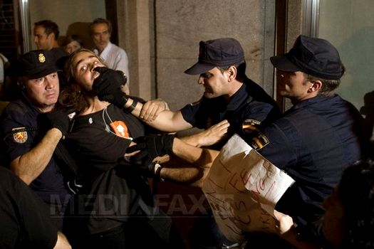 Membrii celor două grupuri, despărţiţi de importante efective de poliţie, s-au insultat reciproc în piaţa Puerta del Sol, aflată în centrul capitalei spaniole, iar în momentul în care poliţia a reţinut un manifestant a avut loc o scurtă confruntare.