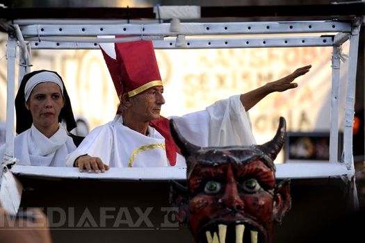 Manifestanţii au purtat un fals papamobil, la bordul căruia se afla o marionetă înfăţişând un Papă care dansa, cu cap de diavol, urmat de un mic alai.