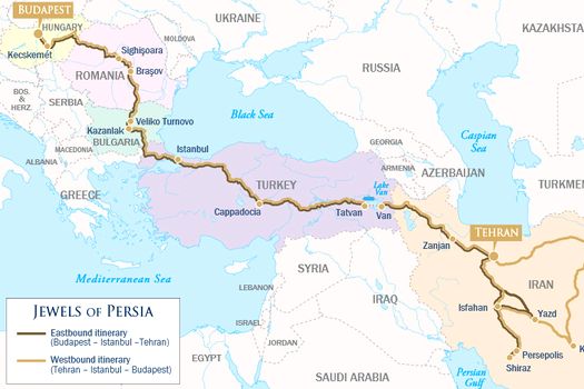Itinerariul de două săptămâni va oferi multiple opriri în destinaţiii turistice, pe teritoriile Ungariei, României, Bulgariei şi Turciei. Înainte de sosirea la Teheran, călătorii vor putea să descopere oraşe iraniene ca Shiraz şi Persepolis.