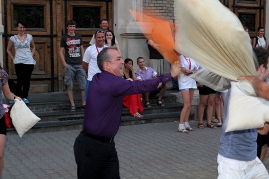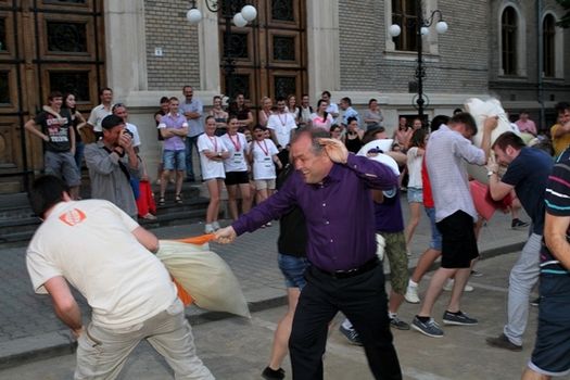Boc a participat la o bătaie cu perne în centrul Clujului, în cadrul proiectului „Cluj Never Sleeps”: ”Am dat, am şi primit, am încercat să mă apăr, dar şi să atac” – FOTO