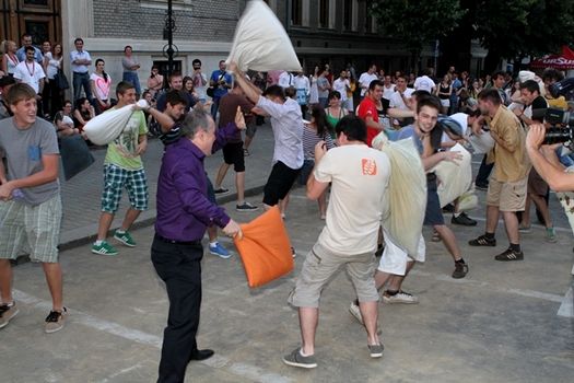 Primarul din Cluj-Napoca, Emil Boc, a participat vineri seară la o bătaie cu perne în centrul oraşului, manifestare care a făcut parte din proiectul "Cluj Never Sleeps", edilul folosind o pernă portocalie.