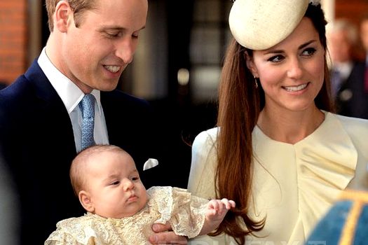 Prinţul George, în vârstă de trei luni, al treilea în ordinea de succesiune la tronul britanic, a sosit la ceremonie în braţele tatălui său, care îl legăna, alături de Kate, care a purtat un taior de culoare bej, o creaţie a casei Alexander McQueen.