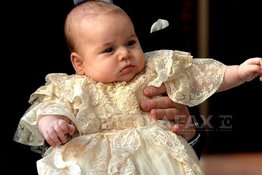 Prinţul George şi-a făcut miercuri, la Londra, cea de-a doua apariţie publică, cu ocazia botezului său, oferind privitorilor imaginea unui chip dolofan şi purtând o rochiţă de botez din satin şi dantelă crem, o replică a aceleia purtate în 1841 de fiica cea mare a reginei Victoria.