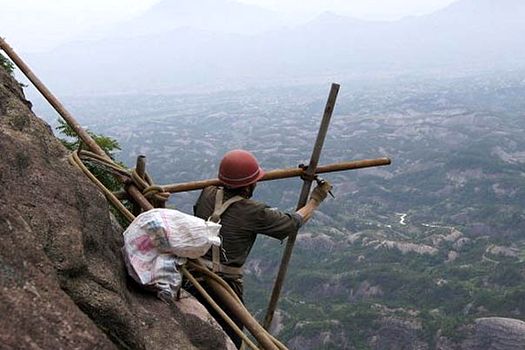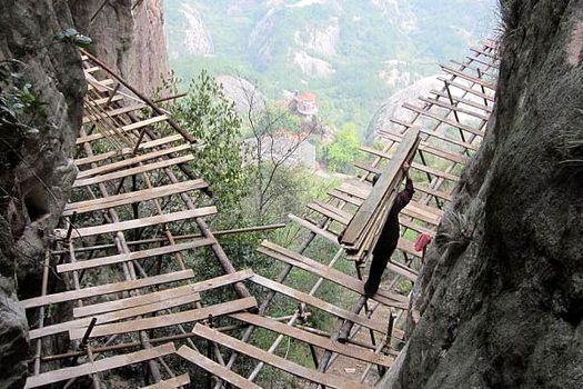 Ceea ce este şi mai uimitor este că drumul are o lăţime de doar un metru, iar muncitorii lucrează cu protecţie minimă. Scândurile din care este făcut drumul par foarte subţiri şi fragile, iar o cădere ar însemna moarte sigură.