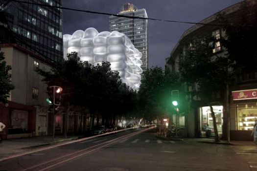 „Clădirea balon” ar putea ajunge realitate folosind materiale gonflabile făcute din nylon antibacterian de culoare albă, amplasate în faţa exteriorului unei clădiri oarecare de birouri din centrul Shanghaiului.