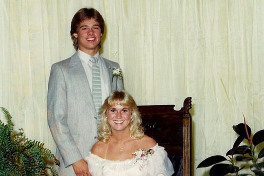 1982 – Brad Pitt alături de iubita din liceu, Tonya Westphalen. Sacou gri, pantaloni albi şi o cravată gri în dungi. A fost votat la bal cel mai bine îmbrăcat băiat.