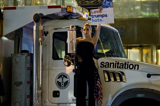 Lady Gaga este înfăţişată într-o fotografie ţinându-şi capul în mâini, cu o figură sumbră, după ce cu ceva timp în urmă, protestase în exteriorul Trump Tower din New York, cu un banner pe care scria „dragostea întrece ura” (în engleză, „trumps” înseamnă „a întrece” sau „a tăia cu atu”, în teoria jocurilor de cărţi, astfel încât Lady Gaga s-a folosit de un joc de cuvinte – n.r.).