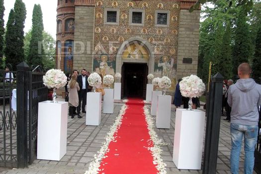 Curtea bisericii unde are lor cununia religioasă a fost împodobită special pentru eveniment. A fost instalat un covor roşu, lung de peste zece metri, pe care au fost aruncate petale de trandafiri, iar de o parte şi de alta au fost aşezate buchete mari de trandafiri albi.