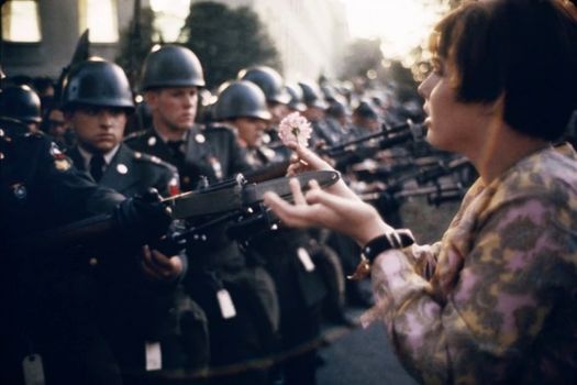 Fotograf: Marc Riboud. Jan Rose Kasmir, de 17 ani, întinde degetele în care aninase o floare de câmp către un soldat. În timpul unui protest anti-război desfăşurat lângă Pentagon în 1967.