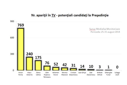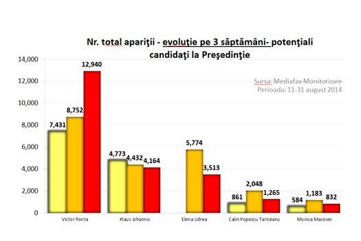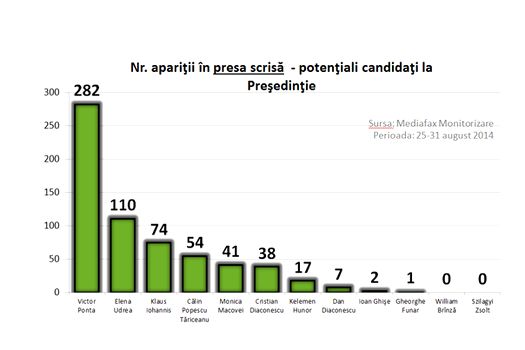 În săptămâna 25-31 august, au scăzut ca număr de apariţii şi menţiuni în media Călin Popescu Tăriceanu, Dan Diaconescu, Cristian Diaconescu, Gheorghe Funar, Ioan Ghise, Klaus Iohannis, Monica Macovei, Szilagy Zsolt şi Elena Udrea. În top a fost inclus şi William Brânză, care şi-a anunţat candidatura la funcţia de şef al statului, din partea Partidului Ecologist.