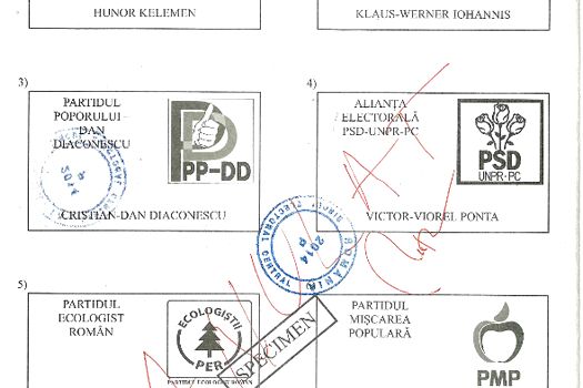 Astfel, pe prima pagină vor fi imprimate opt patrulatere cu numele următorilor candidaţi: Kelemen Hunor (UDMR), Klaus Iohannis (ACL), Dan Diaconescu (PPDD), Victor Ponta (Alianţa Electorală PSD-UNPR-PC), William Brînză (PER), Elena Udrea (PMP), Mircea Amariţei (Prodemo) şi Teodor Meleşcanu (independent).