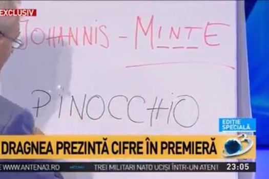 „Iohannis M…E – Păi de ce săriţi aşa? Iohannis minte! Păi la ce v-aţi gândit, nu cred că v-aţi gândit la ce s-a gândit el. Eu am arătat că domnul Iohannis minte. Este un fel de Pinochio ca să spunem aşa”, a declarat Liviu Dragnea, fiind întrebat ce a vrut să transmită cu mesajul „Iohannis M..E”.