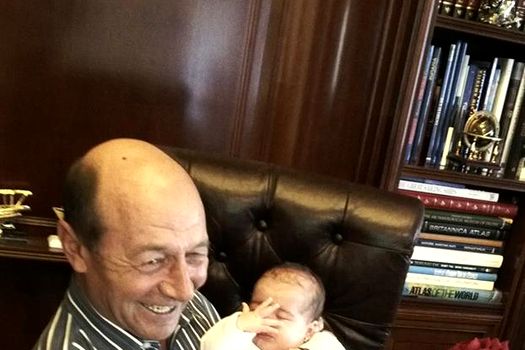În fotografia postată pe Facebook, Traian Băsescu, zâmbitor, îşi ţine nepoata, Sofia Anais, în braţe. Pe biroul din faţă se află un tort şi un trandafir roşu.