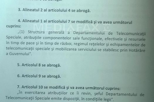 Proiectul de lege prevede totodată că structura generală a Departamentului de telecomunicaţii speciale, atribuţiile componentelor sale funcţionale, efectivele şi resursele în timp de pace şi în timp de război, regimul reţelelor şi echipamentelor de telecomunicaţii speciale şi mobilizarea serviciului se stabilesc prin Hotărâre de Guvern.