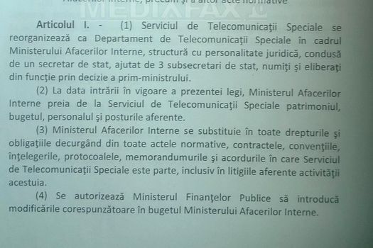 Proiectul de lege are cinci articole, primul dintre acestea prevăzând că STS se reorganizează ca Departament de Telecomunicaţii Speciale în cadrul MAI şi devine o structură cu personalitate juridică condusă de un secretar de stat ajutat de trei subsecretari de stat, care sunt numiţi şi eliberaţi din funcţie de către premier.