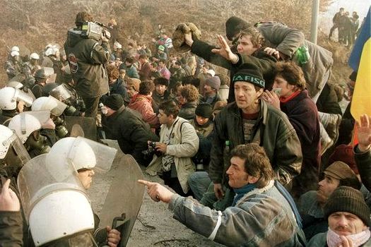 Două cordoane de trupe ale Unităţii Speciale de Luptă Antiteroristă (USLA) au înconjurat apoi piaţa cu autobuze din dotarea Poliţiei, atmosfera devenind tot mai tensionată. Au izbucnit violenţe între manifestanţi şi trupele USLA, fiind aruncate pietre şi cocteiluri Molotov, iar autobuzele Poliţiei fiind incendiate. Au fost atacate şi incendiate sediile Poliţiei Capitalei, Ministerului de Interne şi SRI.