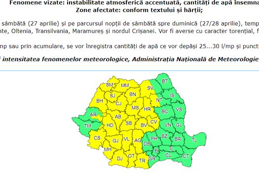 „Fenomenele se pot produce cu probabilitate şi intensitate mai mare în intervalul 27.04.2019 ora 22.00 – 28.04.2019 ora 09.00 pe unele râuri mici din judeţele: Bihor, Hunedoara, Arad, Caraş – Severin, Gorj şi Vâlcea”, mai spun reprezentanţii Apelor Române.