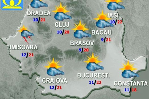 Marţi, cerul va fi variabil în ţară mare parte din zi, dar după-amiaza şi noaptea instabilitatea atmosferică se va accentua în jumătatea de sud-vest a ţării, unde vor fi averse, descărcări electrice şi izolat, grindină. În cea mai mare parte a Banatului, Olteniei şi în zona Carpaţilor Meridionali şi Occidentali cantităţile de apă vor depăşi local 20…25 l/mp şi izolat, mai ales la munte, 35…40 l/mp. Temperaturile maxime, în scădere faţă de ziua precedentă în regiunile sud-estice, vor fi cuprinse între 16…17 grade pe litoral şi 23 de grade în Muntenia şi sud-vestul Transilvaniei, iar cele minime se vor încadra între 6 şi 13 grade.