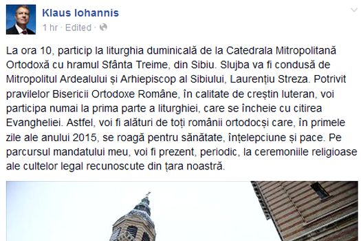 ”Astfel, voi fi alături de toţi românii ortodocşi care, în primele zile ale anului 2015, se roagă pentru sănătate, înţelepciune şi pace. Pe parcursul mandatului meu, voi fi prezent, periodic, la ceremoniile religioase ale cultelor legal recunoscute din ţara noastră”, mai scria Iohannis.