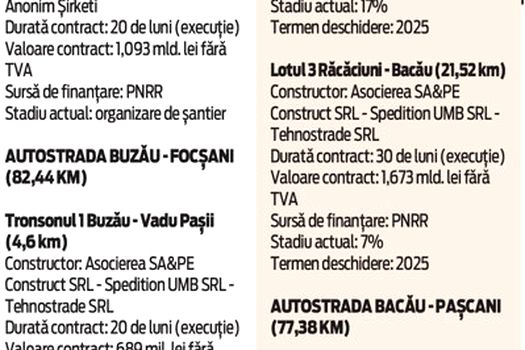 Autostrada Moldovei, cel mai amplu proiect de autostradă aflat în derulare în România, se apropie de finalizarea primelor loturi, potrivit estimărilor Companiei Naţionale de Administrare a Infrastructurii Rutiere. Astfel, până la sfârşitul anului 2024, ar urma să fie gata lotul 1 Dumbrava – Mizil (21 km), construit de asocierea Impresa Pizzarotti&SPA – Pizzarotti SA – Retter Projectmanagement SRL, lotul 2 Mizil – Pietroasele (28,35 km), construit de asocierea SC Coni SRL – Trace Group Hold PLC, dar şi tronsonul 1 Buzău – Vadu Paşii (4,6 km) şi tronsonul 4 Mândreşti Munteni – Focşani (10,94 km), de care este responsabilă asocierea SA&PE Construct SRL – Spedition UMB SRL – Tehnostrade SRL.
