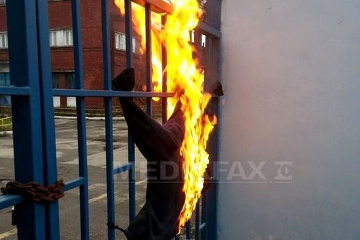 La un moment dat, unul dintre protestatari a legat o salopetă de gardul combinatului, a stropit-o cu benzină, după care i-a dat foc.