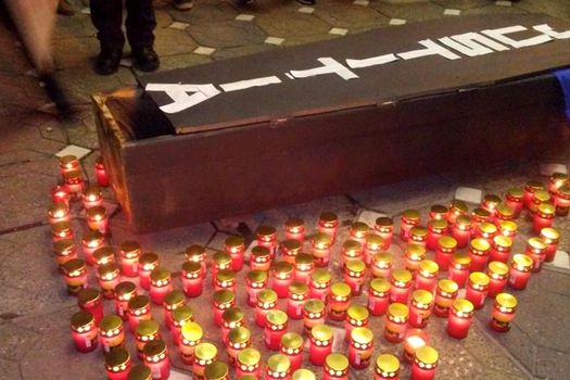 Studenţii au aprins zeci de candele pe care le-au depus lângă sicriul pe care scrie “Justiţie”, unul dintre protestatari precizând că “nu ne dorim să se ajungă aici, să îngropăm justiţia”.