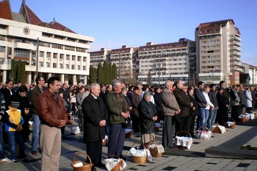 „Puterea credinţei, conştiinţa că toţi aparţinem lui Hristos ne aduce aici, împreună, în fiecare an să sfinţim bucatele. Este o stare de bine când ne pregătim să venim cu coşurile pline, fiecare cu ce are, ne sfinţim şi sufletul la slujbă iar acum – după atâta ploaie – bate şi soarele, este foarte bine”, a declarat corespondentului MEDIAFAX Fulop Bela, unul dintre miile de credincioşi catolici, reformaţi şi protestanţi participanţi la prima slujbă din Duminica Paştelui.