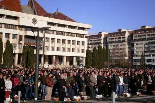 Ritualul sfinţirii bucatelor, care marchează încheierea postului de 40 de zile al Paştelui, s-a desfăşurat pe platoul din faţa Palatului Administrativ din Miercurea Ciuc, în aer liber, potrivit unui obieci instituit în urmă cu mai mulţi ani de Tamas Jozsef, episcop auxiliar al Arhidiecezei romano-catolice de Alba Iulia, transmite corespondentul MEDIAFAX.