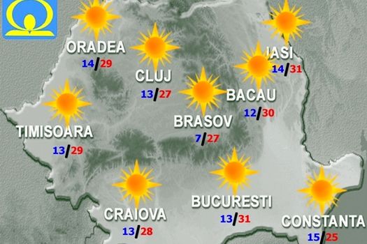 În Bucureşti, vremea va fi frumoasă şi deosebit de caldă. Cerul va fi senin, iar vântul va sufla în general slab. Temperatura maximă va fi de 30…31 de grade, iar cea minimă de 11…13 grade.